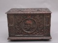 19th Century carved oak log box, profusely carved all over, the top having a coat of arms with dragons either side, the hinged top opening to reveal a large storage space for logs, the corners having brass straps, standing on turned bun feet. Lovely crisp carving and very well carved. Circa 1850.