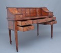 A fabulous quality freestanding 19th Century satinwood and inlaid Carlton house desk, the super structure having a decorative pierced brass gallery, below this there is a central cupboard door flanked either side with three drawers with original engraved brass knob handles, and then a concave cupboard door either side of the drawers, all doors have workable locks and keys, the desk having a pull out green leather writing surface decorated with blind and gilt tooling, either end of the desk there are stationary compartments with hinged lift up lids and a single pull out drawer below, the frieze below having five mahogany lined drawers with original engraved brass swan handles, standing on square tapering legs with with spade feet terminating on brass cap and castors. This desk is in excellent condition and profusely inlaid all over incorporating various shell motifs, urns and floral inlay. The table has a retailer’s label for “Druce & Co. 68, 69 and 58 Baker street, Portman square. Circa 1890.
