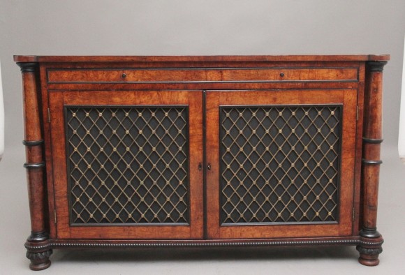 A superb quality early 19th Century pollard oak and ebony cabinet in the style of George Bullock, having a wonderfully figured rectangular top decorated with ebony inlay, a long frieze drawer below with the original ebonised turned handles and the drawers front having an ebonised edge, two large cupboard doors below with decorative brass grills in each panel, opening to reveal two shelves inside, the doors flanked either side with bold turned columns incorporating ebonised turnings at the top, centre and bottom of each column, carved beaded decoration running along the bottom and sides of the cabinet and standing on turned and carved feet. Superb colour and figuration and in excellent condition. Circa 1810.